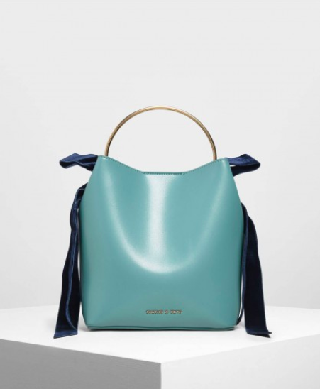 一體成型的水桶包造型,搭配優雅甜美的蝴蝶結細節,金屬的環狀把手搭配藍綠色調的皮面帶來屬於夏日的清爽感!