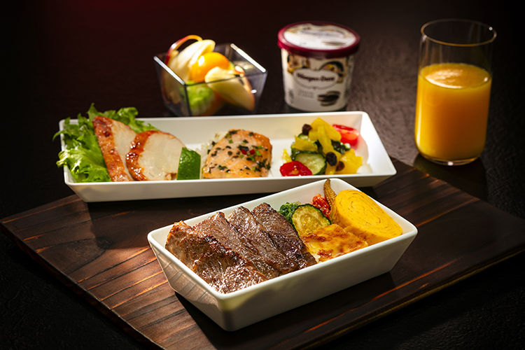 不只商務艙!豪華經濟艙與經濟艙的機上餐也有升級,豪華經濟艙推出和牛等級餐點「老乾杯日本A5和牛燒肉飯」與「老乾杯日式和牛漢堡排飯」,經濟艙則推出「乾杯經典牛五花燒肉飯」讓吃貨們在萬米高空也能大啖美味。