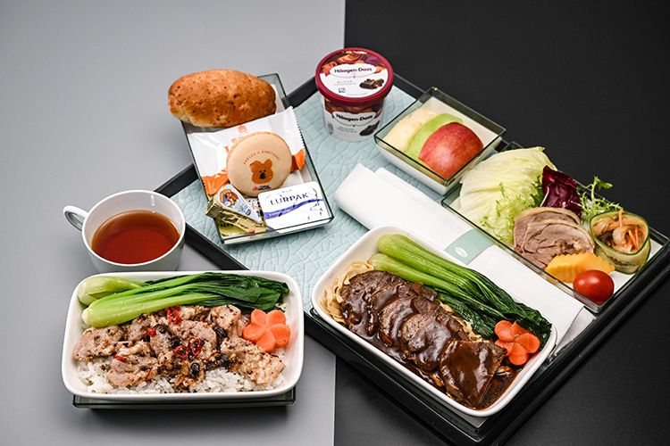 豪華經濟艙、經濟艙旅客也與米其林三星餐廳零距離!豪華經濟艙主菜以主廚私房菜為構想設計獨家料理:家傳牛肉撈麵、豆豉蒸肉排煲仔飯。經濟艙旅客則能享用「蝦仁叉燒星洲炒米粉」以及「咖哩蝦仁魚蛋撈麵」,多款道地粵菜在機上就能享用。