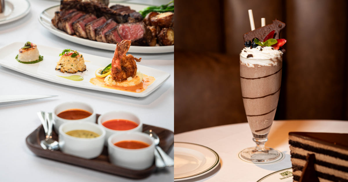 台北店的經典菜色台中更是一樣都沒少,包含為了迎合台灣人喜好推出的經典前菜三拼,將憤怒蝦、蟹肉餅和香煎干貝三款熱門前菜組合成拼盤,美味一次嘗盡;巴菲特必點的乾式熟成帶骨紐約客牛排,濃郁肉香與帶勁口感擄獲無數美國人;乾式熟成帶骨肋眼牛排,油花豐富、肉質軟嫩則是台灣人的最愛。如果是聚餐宴客,則首推乾式熟成美國和牛戰斧牛排,重量級 44OZ. 懸吊登場,桌邊秀以火槍炙燒乾式熟成牛油,香氣逼人的牛油為烤至焦酥的牛排增添風味,讓人視覺味覺雙重享受。除了牛排,餐廳也提供各式新鮮海鮮,有多人可分享的海鮮塔或是個人主餐海鮮熱盤;甜點則必點巨大巧克力蛋糕,濃郁且濕潤的巧克力蛋糕與慕斯交疊高達十層,不但好拍更好吃!