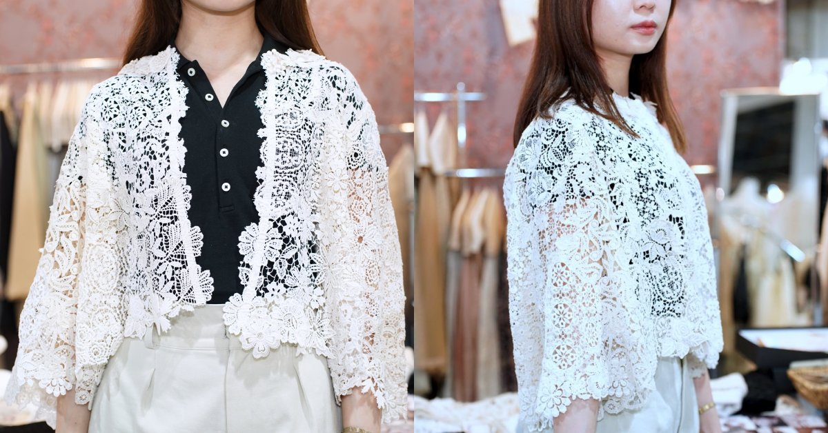 主打蕾絲刺繡的「REI THE LACES CHAMBER」服裝風格相當鮮明,產品款式也相當多樣,從披肩、外套、上衣、洋裝等應有盡有,將各式各樣的花紋拼接成不同的圖案排列,有著豐富的蕾絲刺繡設計,尤其是鏤空的披肩外套,非常適合夏天,入手一件既清涼又能增添層次感。