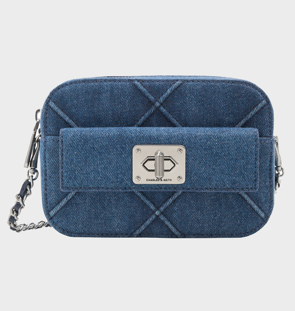 以絎縫菱格設計,搭配丹寧布料彰顯出截然不同的率性風格;銀色金屬轉釦點綴,更顯恰到好處的愜意休閒,迎接炎炎夏日。