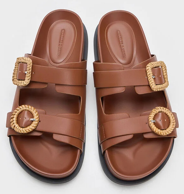 「小CK × 浪浪」廣告視覺新品推薦8:咖啡色編織釦雙帶厚底拖鞋,NT$ 2,390。