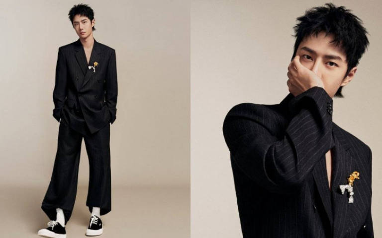 在官方發佈的首波形象照中,王一博的首套look是身穿略帶寬鬆感的黑色條紋套裝,外套內刻意什麼都不搭的穿法,腳上再套上一雙休閒帆布鞋,更能突顯時髦個性感。