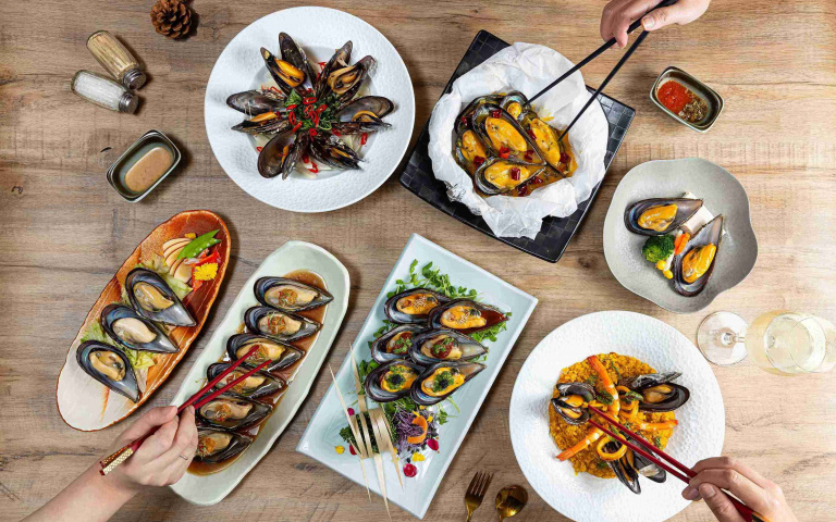 福粵樓中餐廳推出三道淡菜料理「金蒜甘露蒸淡菜」、「淡菜冰鎮三重奏」以及主打鮮、香、麻三味完美融合的「紙包金湯燜淡菜」,蔡長庚行政主廚以秘製配方熬製湯底呈金黃色澤,精選每顆肥美碩大的淡菜落入金湯之中,經高溫悶煮後華麗變身,豐盈Q彈的貝肉飽含金湯微酸中帶點爽口微辣風味,同時以花椒提味出恰到好處香麻口感,淡菜豐沛甘醇滋味豔驚四座!