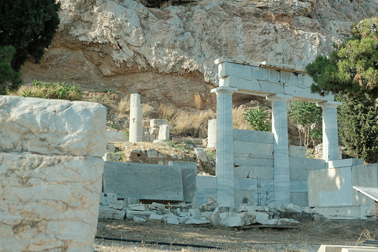 再進入衛城最上層時會先經過一個劇場「海羅德斯阿提卡斯音樂廳」,這是非常典型的環狀劇場設計,除了讓視野更集中外,環狀設計在沒有音響的古時候,更能有效傳達音效。這跟衛城的建成並不是在同一時期,是於600多年後貴族希羅德阿提卡斯建造,要用來舉辦音樂會,當時是有木造屋頂但後來因失火被燒毀,而建築體是使用大理石建成,因此免於祝融之災。