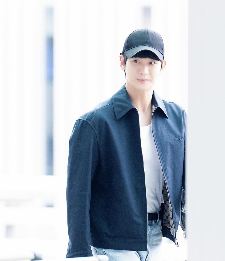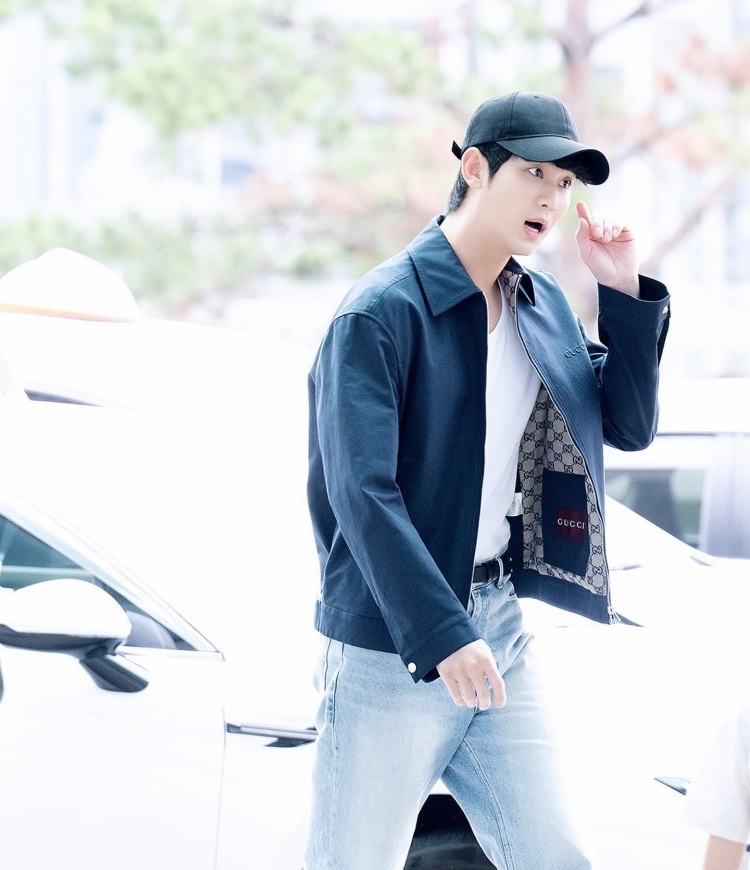 金秀賢剛剛在韓國仁川機場準備上飛機來台舉辦見面會,作為韓劇收視保證的男神,他有著自己穿搭上的邏輯,近期被拍到的機場穿搭上,他習慣以黑色棒球帽、白色T恤、牛仔長褲或黑西裝褲來做基礎的搭配,而外套上他這次選擇來自Gucci的深藍色斜紋夾克以及一雙雙G logo的小白鞋,在輕鬆的同時,展現穩重的魅力!