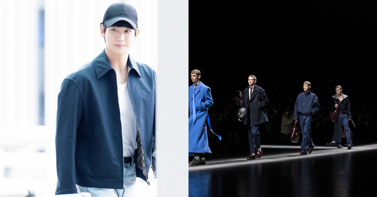 這次金秀賢所上身來自Gucci男裝夾克以及一雙小白鞋,深藍色的面料,簡練的夾克線條,呼應著2024秋冬男裝大秀上相當極簡線條的美學,新設計師Sabarto De Sarno以不同設計以及筆觸,重新建構男裝的設計,也使得近期Gucci的男裝系列讓更多男明星搶著上身。