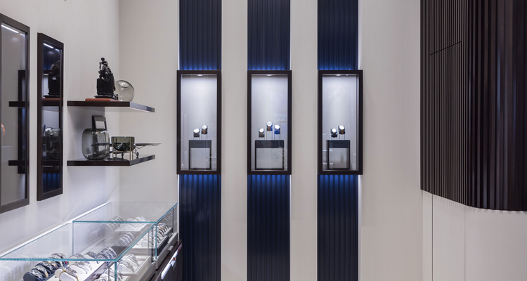同時,浪琴為了展現年輕有活力的優雅時尚氛圍,讓細緻的品牌代表色深藍色牆面加入品牌專屬的菱格紋設計,讓簡約時尚的空間中加入一分品牌獨有的從容優雅。