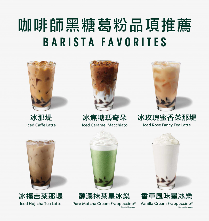 炎熱夏季,星巴克推薦咀嚼系飲料滿足你的口感,並特別請星巴克咖啡師推薦6款適合添加黑糖葛粉的飲料。像是香草風味星冰樂、冰福吉茶那堤、冰焦糖瑪奇朵等冰飲皆相當適合。此外,於7月23日前凡點購任一冰飲,即可享有以加購價10元添加黑糖葛粉或杏仁豆腐的優惠,將冰飲升級為咀嚼系飲料。