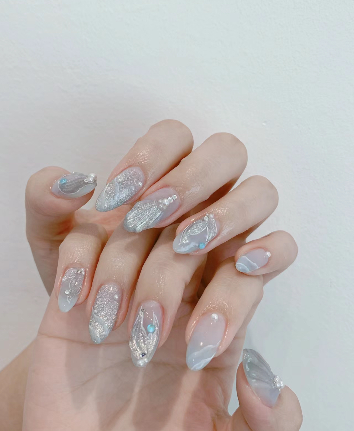 絕對是小編下個最想嘗試的款式(笑)光是看著就能感受到這組美甲所散發出的迷人海洋氛圍,就像是在陽光下閃閃發光的美人魚鱗片~冰透藍色的底色帶來清爽感,搭配銀色的設計形成華麗的效果。不管是海邊度假還是城市派對,這種設計都能夠讓你的指尖散發出獨特的魅力!