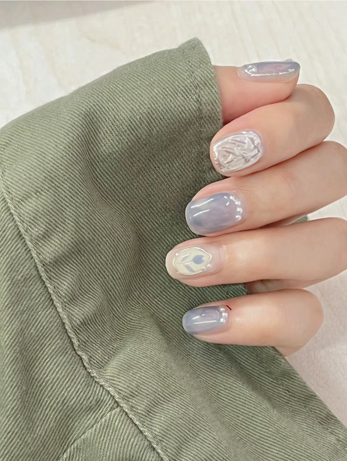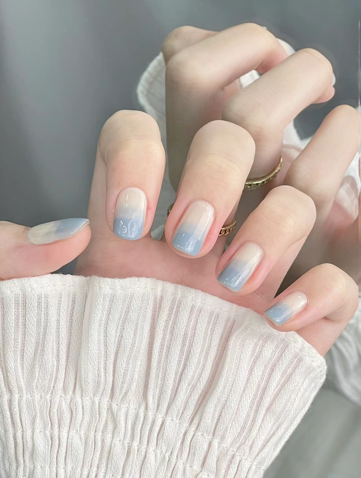 這款美甲給人一種柔和的清新感,淡淡的藍色與透明底色漸層融合,宛如夏日的藍天白雲,讓人感到舒適與放鬆~讓你的指尖在夏日裡散發出一抹恬靜的美麗。