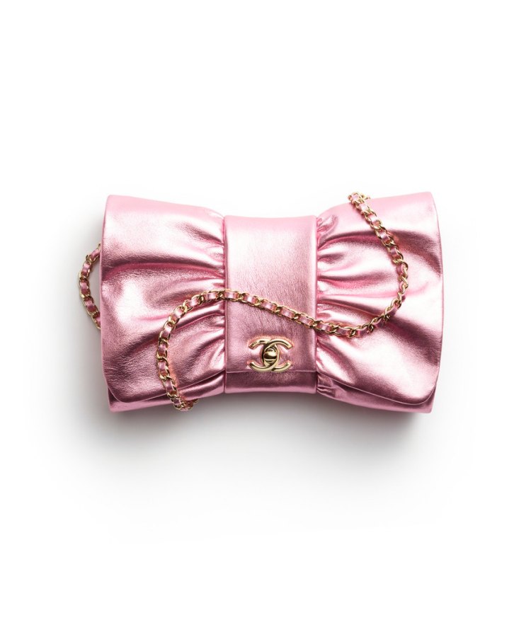 不排除 Chanel 的設計師都學過讀心術!這款蝴蝶結造型包款,可愛的廓形已成功爆擊女孩的心!搭配上粉色的金屬皮革,真的讓人愛不釋手。(商品售價:NTD164,300)