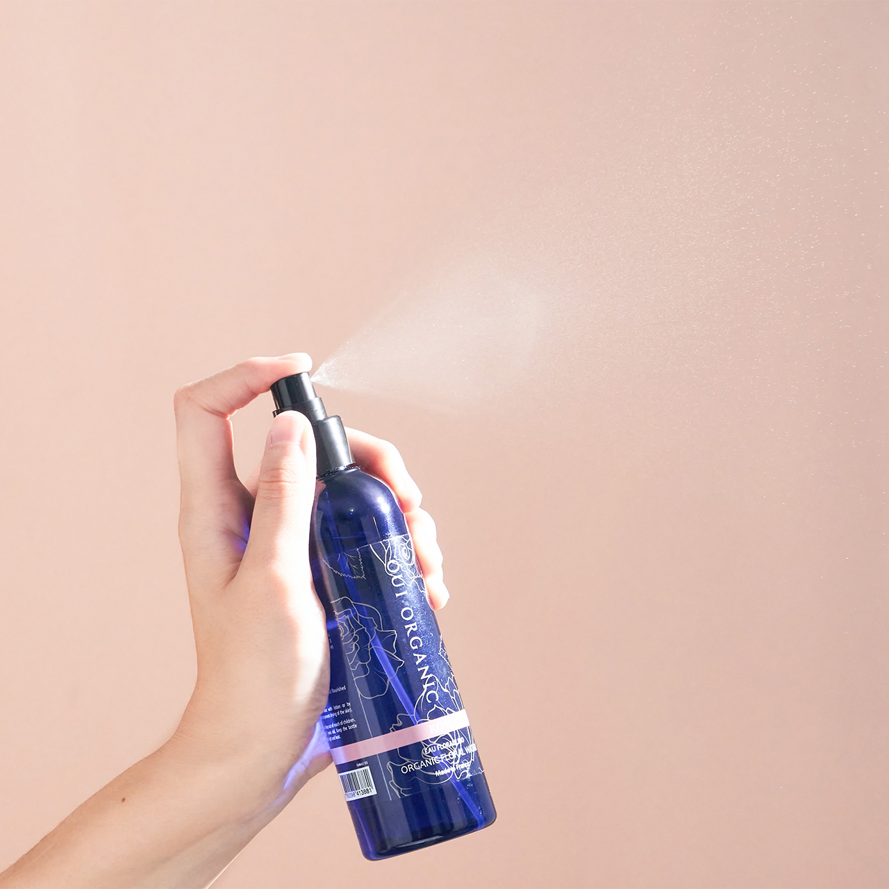 - 閉上雙眼,讓純露花水距離臉部約15-20公分的距離,以Z字型從額頭到雙頰移動噴灑