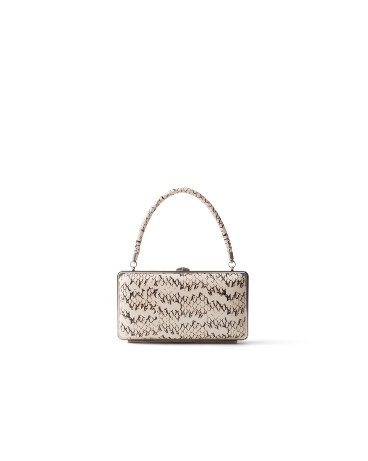 想要在party上既不撞包又豔光四射?Prada這一季推薦你來點「蟒蛇紋」!圖片這款晚宴包,以淺色的動物紋理呈現,搶眼但並不招搖,只要搭上一件簡單的小黑洋裝,時尚造型完成度就很高分!(價格店洽)