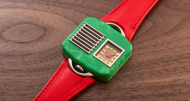 直接以收音機微縮版本呈現的「Retrovision' 47」,品牌巧妙地將這些設計元素表現在錶殼上,採以手工彩繪的鈦金屬所精心打造,其仿效古董廣播收音機外殼的綠色及白色大理石紋路,就宛如像是真的將收音機轉換成手上戴的腕錶般,再配上紅色錶帶,引人注目的視覺效果,讓造型與功能的完美結合,懷舊也不失現代感。