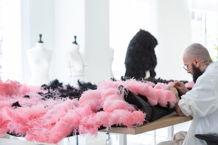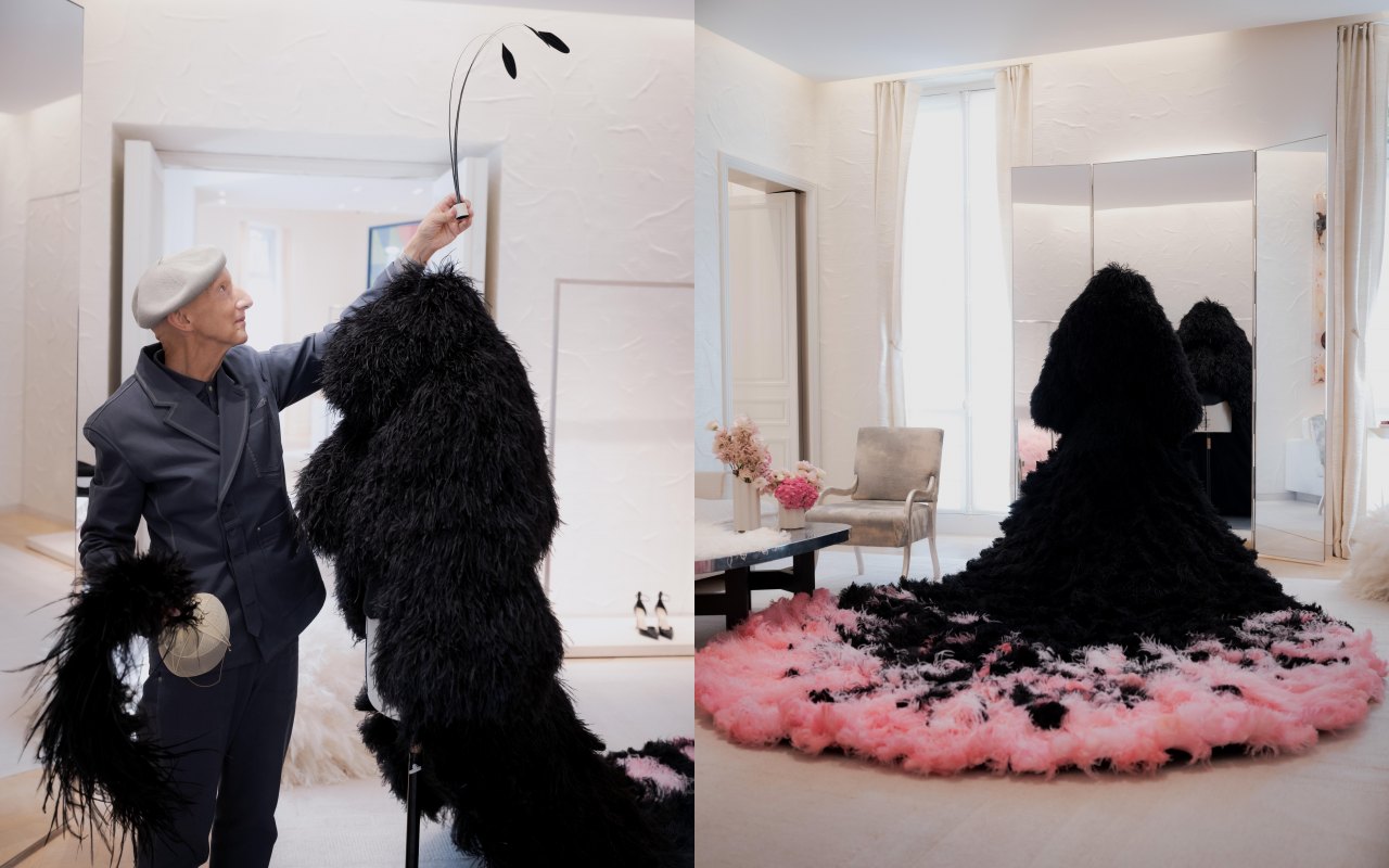 這次的演出服,Dior 女裝創意總監 Maria Grazia Chiuri 以 1954 年電影《龍鳳配》(Sabrina)中的奧黛麗赫本(Audrey Hepburn)為靈感,整體服裝以鳥類換羽期間收集的羽毛製作,黑色短夾克與拖地的粉色裙擺形成極為浪漫的畫面,而褪去外套後的內搭馬甲,則是由法國百年品牌 Cadolle 操刀,而其延伸視覺的帽飾,則是由 Dior 長期合作的帽子設計師 Stephen Jones 一手打造。