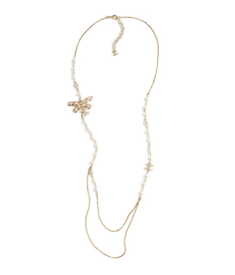 這條金色的長項鍊一樣運用珍珠、蝴蝶結及雙 C logo 做組合,在運用上不管是單圈作為延伸脖子線條的裝飾,又或是繞兩圈以多層次的短鍊呈現,女孩能順應自己的穿搭風格,展現這條項鍊各種搭配的可能性。(商品售價:NTD64,700)