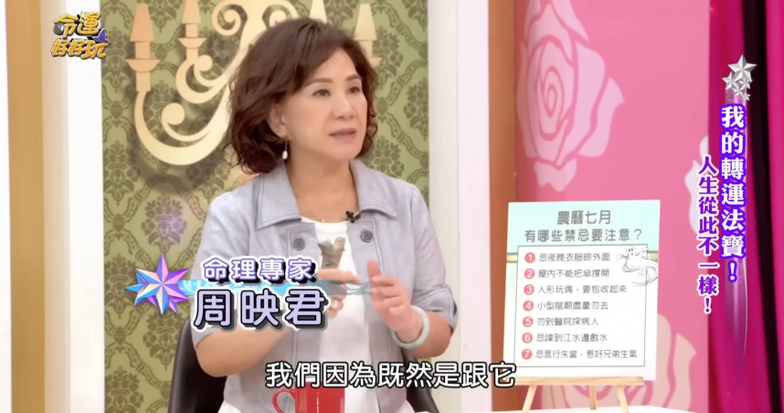 今(4)日為農曆七月一日,也是民間傳聞的鬼門開的日子,在這被俗稱為「鬼月」的日子中,民間流傳許多相關的禁忌。近期,命理專家周映君在出席《命運好好玩》錄影時,就列出了鬼門開的7大禁忌,其中更是呼籲民眾「不要鐵齒」。