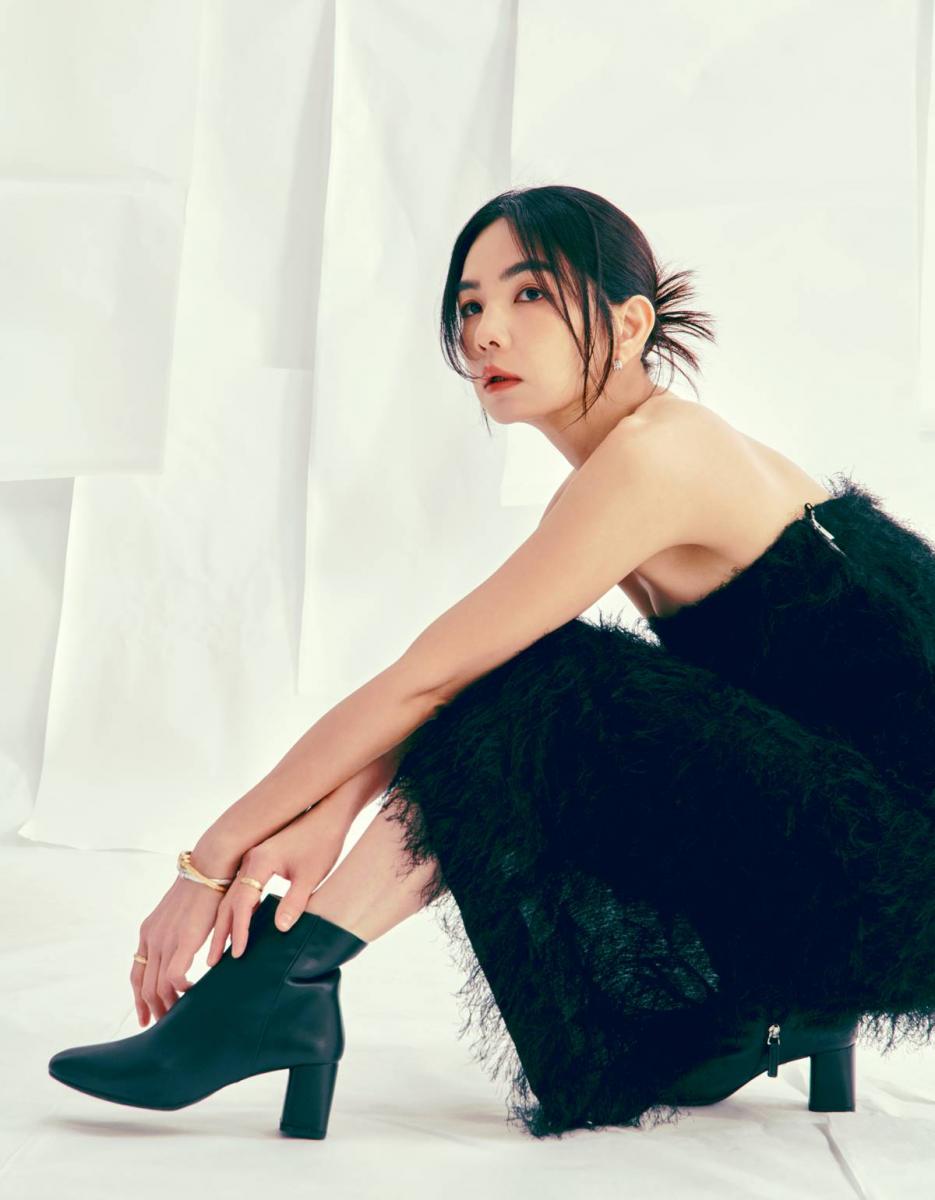 毛料平口洋裝 by Ferragamo;亮皮短靴 by Repetto;(上至下)玫瑰金項鍊、玫瑰金鑽石耳環、18K白金宮廷式雕刻飾紋鑽石手鐲、玫瑰金宮廷式雕刻飾紋鑽石手鐲、玫瑰金鑽石戒指、玫瑰金鑽石戒指,all by PIAGET「Possession」系列。