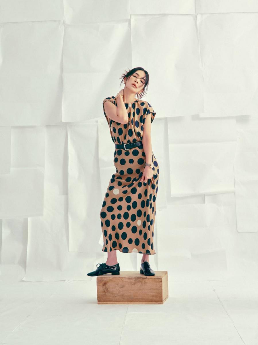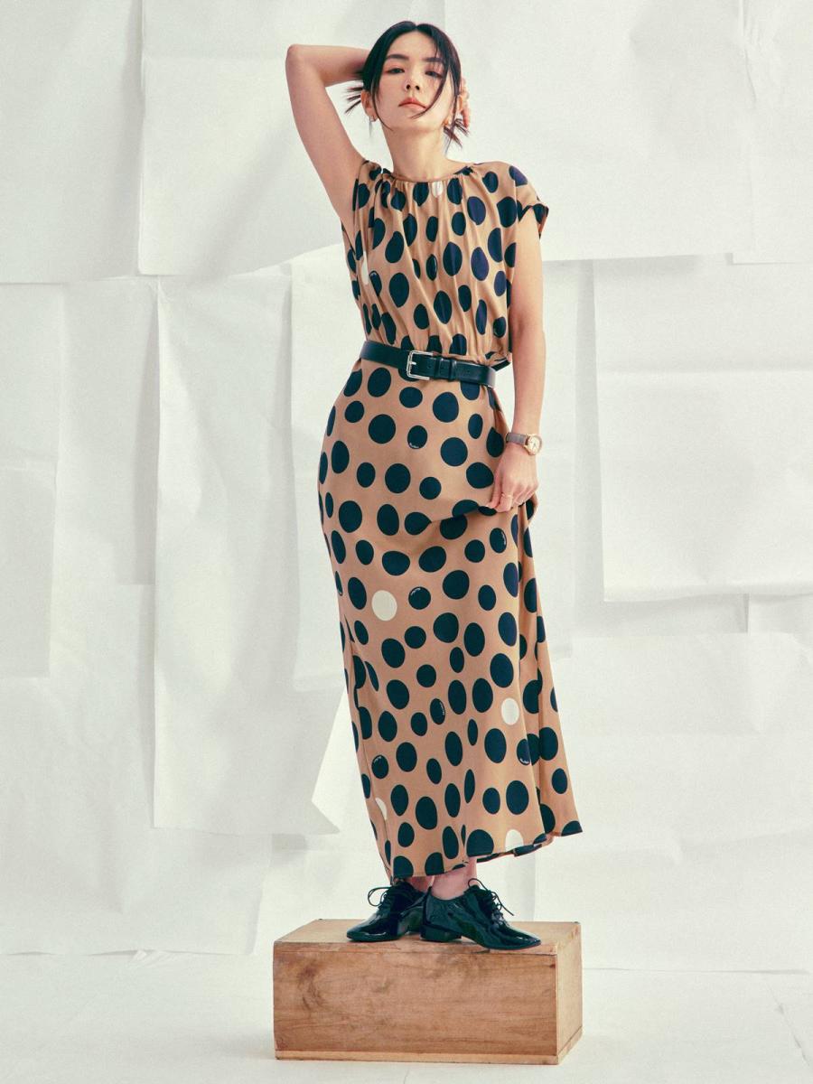圓點印花長洋裝、黑色皮帶,both by Max Mara;亮面平底鞋 by Repetto;(上至下)「Possession」系列玫瑰金鑽石耳環、18K白金宮廷式雕刻飾紋鑽石手鐲、玫瑰金宮廷式雕刻飾紋鑽石手鐲、玫瑰金鑽石戒指;「PIAGET Polo」系列玫瑰金鑽石腕錶,all by PIAGET。