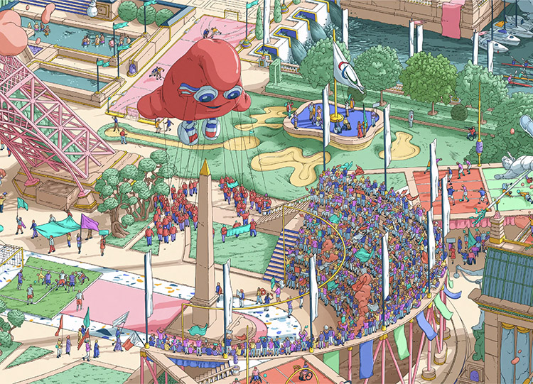 本次巴黎奧運強調性別平權,代表法國出賽的選手男女比例是一樣的,而這一理念在海報的人數上也能發現小巧思,也很歡迎大家玩玩《威利在哪裡?》,Ugo Gattoni在裡面偷偷藏了8隻吉祥物「弗里吉」。根據巴黎奧運官網介紹設計中包含四大元素:奧運象徵(奧運五環、殘奧三色標誌、奧林匹克格言等)、巴黎與法國的象徵(艾菲爾鐵塔、瑪麗安娜、法國飛行表演隊、巴黎地鐵、塞納河、凱旋門等)。