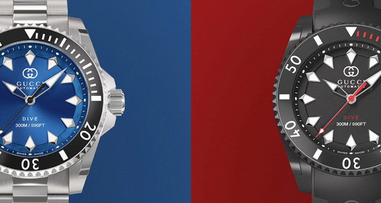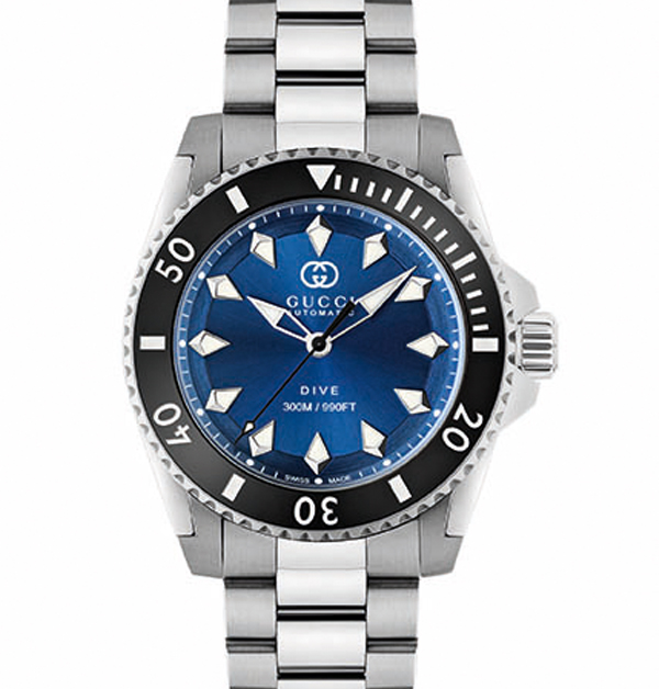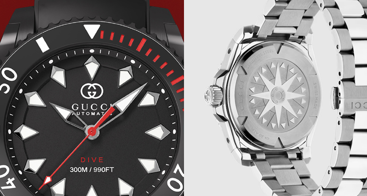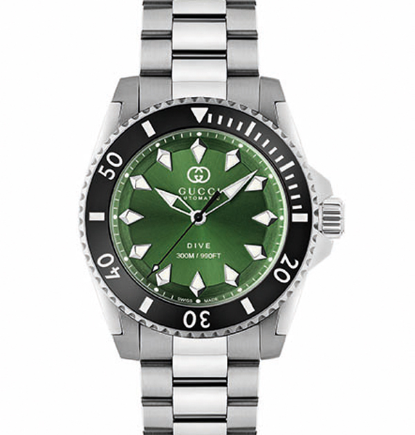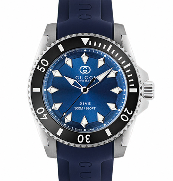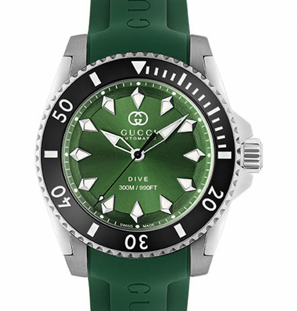 這次的Gucci「Dive」自動腕錶新款,備有2種不同材質的錶帶可以選擇,一是經典雋永的精鋼錶帶,以及帶有強烈運動風格的橡膠錶帶。其中2款腕錶,採用的是迷人的海藍或碧綠錶面搭配精鋼鍊帶與錶殼;另外3款,則是配以品牌名字樣的運動風格橡膠錶帶,不僅與錶面色彩相互輝映,更顯其獨特熱血的運動風格。