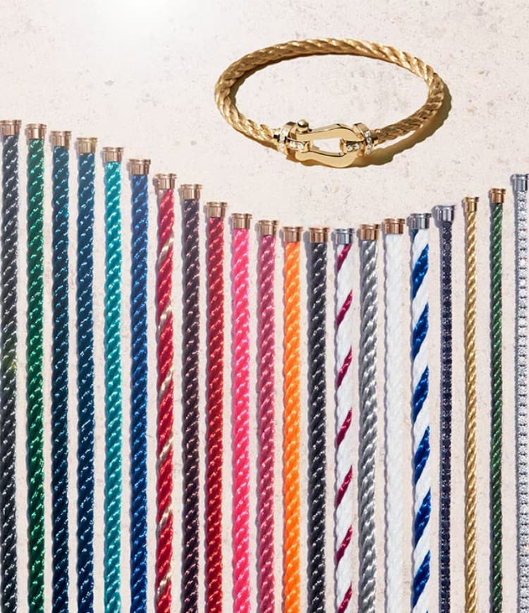 Force 10 系列手鍊誕生於1966年,是 FRED 最具代表性的作品之一。1992年出版的《一名珠寶商的回憶錄》(Memoirs of a Jeweler)一書中提到,這條手鍊的靈感來自於創辦人長子 Henri 設計的帆船繩結,他當時想到用鉚釘固定航海纜繩兩端,再點綴上一個繩鉤形狀的扣飾,做成手鍊送給妻子做為生日禮物,以此象徵堅韌與永恆的愛。手鍊的名字「Force 10」代表的是航海中最高等級的風力,象徵著無畏風暴的勇氣與決心。這條手鍊不僅是一件珠寶,更是一種精神象徵,吸引了無數追求自由、冒險與堅貞愛情的時髦人士。