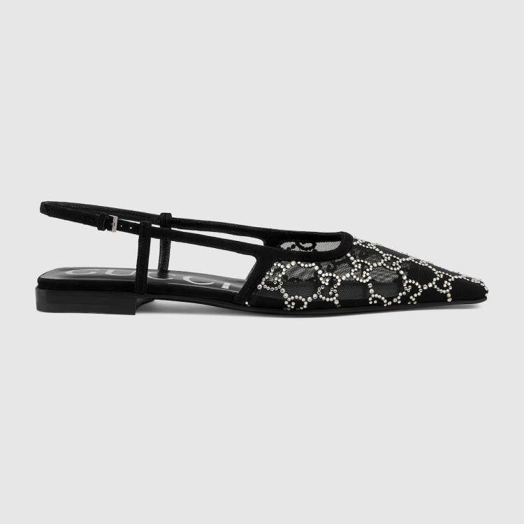 Gucci自從由創意總監Sabato De Sarno接棒之後,對於包袋鞋履的發展野心可說是不容小覷,這回他把經典GG圖案改造成閃亮水晶,並點綴在黑色透視網布材質上,搭配尖頭設計和皮革絨面鞋帶,巧妙把性感張力拉到最大!(售價店洽)