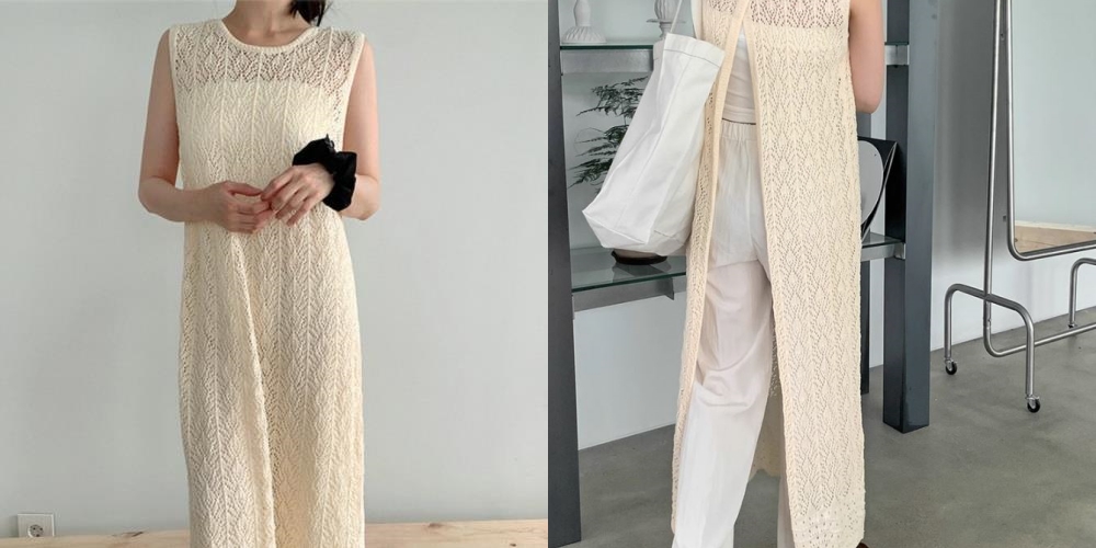 除了碎花洋裝之外,針織或蕾絲背心洋裝也是多層次穿搭很常出現的單品,短的或長的背心裙都很適合拿來做搭配。且針織背心因為顏色單一,不像印花洋裝有太多的圖案,所以可以搭配的下半身單品較多元。就以下面這件針織背心連衣裙來說,就可以搭配各種顏色的雪紡西裝褲或直筒牛仔褲。