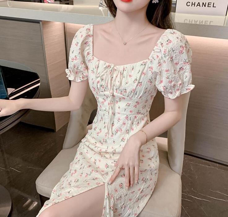 多層次穿搭單品推薦一:法式方領碎花開叉連身裙