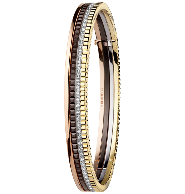 「Quatre Classique」三色金鑲飾巧克力棕色陶瓷及鑽石手環,NT$ 609,000。