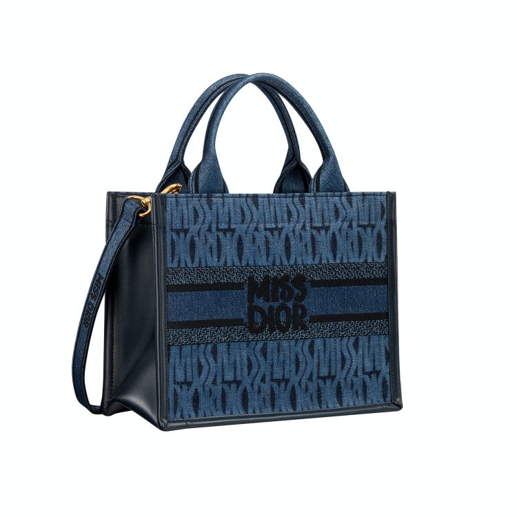 3/Booktote藍色煙燻Miss Dior Allove字樣刺繡丹寧小牛皮小型托特包