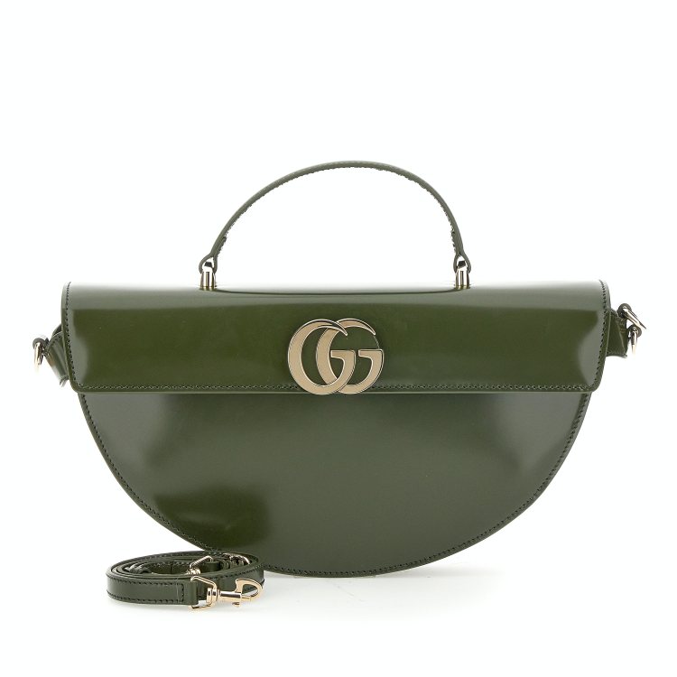 「簡約」是 Gucci 當今伸展台上的設計重點,回到包袋上,如何讓一款包在維持簡約的風格下,但同時跳脫方方正正的設計框架?Sabato De Sarno 選擇以奇趣的半月廓形呈現,這款名為「 Half Moon Bag」的包款,以半圓形的線條,搭配上亮面的皮質呈現,在包身上金屬鑲飾的 GG logo 成整體設計畫龍點睛的一環,可肩背、手提特性,則增添其包袋的實用性,在配色上除了有品牌全新識別色「Ancora」紅之外,同時還推出墨綠及芥末黃兩款配色。