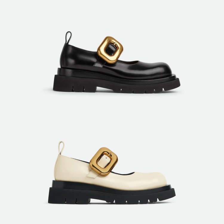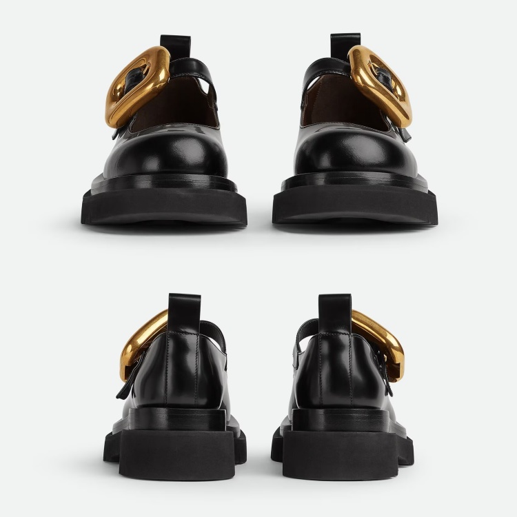 Bottega Veneta 這雙 Lug Mary-Jane 鞋款的最大特色,莫過於鞋面上那顆金屬飾面的巨型方釦。這一設計不僅在視覺上成為整雙鞋的焦點,也為經典的瑪莉珍鞋款注入了現代感與未來風采。金色飾面的運用,為簡約的鞋身增添了一股搶眼而怪誕的氣息,穿在腳上,就此成為不可忽視的時尚符碼。