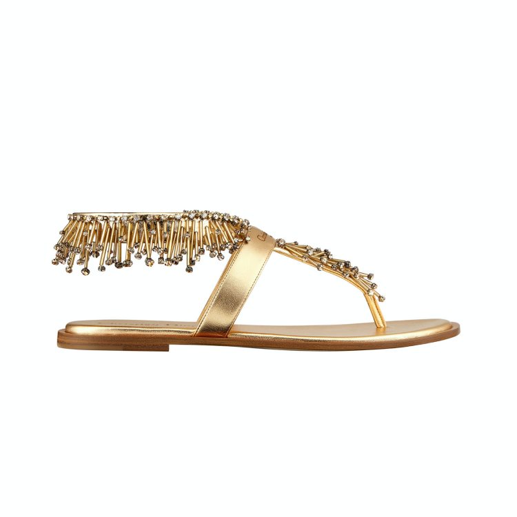 這雙以珠飾點綴的金色涼鞋,其流蘇元素帶來的律動感,讓女孩在行走時展現優雅與時髦的氣息,細膩的珠串設計,同時也展現其品牌細膩的工法。(價格店洽)