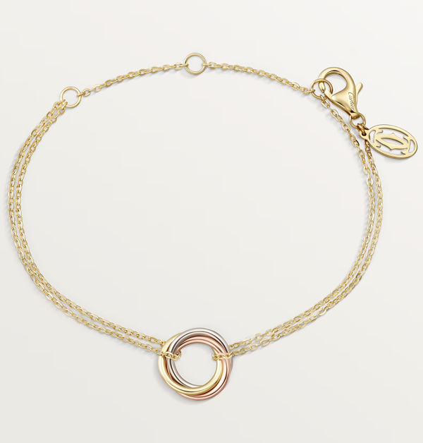 卡地亞(Cartier)「Trinity」三環戒圈的材質,主要是以黃K金、白K金及玫瑰金所構成,而這三種不同顏色的貴金屬,背後亦被賦予了三種不同面向的情感延伸(友情 ∕ 親情 ∕ 愛情),也因此讓不少消費者們會選擇此系列,作為人生中每段珍貴的回憶及情感相連的最佳見證珠寶。而相較於其它款式,手鍊價位格外親民,完全可以推薦儂粉們入手!