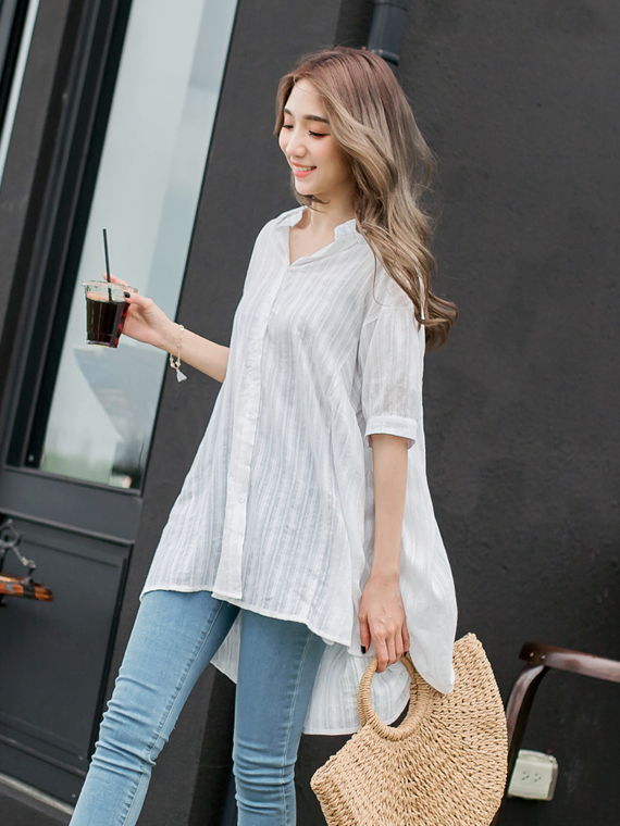 2.高含棉直條紋前短後長七分袖襯衫罩衫