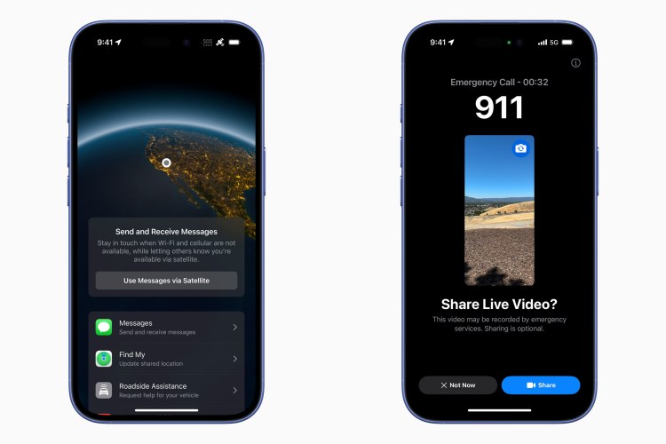 兩系列四款機型均新增保持聯繫的創新方式,並具備強化的安全功能,升級「透過衛星傳送的 SOS 緊急服務」可連接至位置最接近的衛星,在無網路和Wi-Fi的情況下,以iMessage和簡訊收發文字、表情符號和點按回應。iOS 18中透過衛星傳送的訊息經端對端加密,讓使用者能在緊急通話中與適用的救援單位分享即時視訊影像或照片。