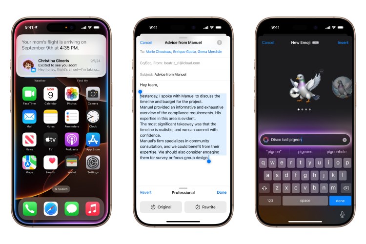 近幾年做熱議的AI人工智能,也將大幅度結合Apple Intelligence,根據個人使用情境簡化並加速日常任務,保護使用者資料的隱私與安全性,Siri也將能結合ChatGPT。可透過全系統「Writing Tools」來提升寫作品質,方便改寫、校對和摘要文字。原創「Genmoji」的功能,溝通和自我表達也變得更加有趣,「Image Playground」則讓使用者快速創造出趣味圖片。也會統整通知,並透過「郵件」中的「Priority Messages」功能優先顯示具時效性的訊息。可在「備忘錄」和「電話」App 中對音訊內容進行錄製、逐字稿謄錄,以及摘要。錄製「電話」App 的通話時,系統會自動發送通知給通話參與者,通話結束後生成摘要,回顧重點內容。