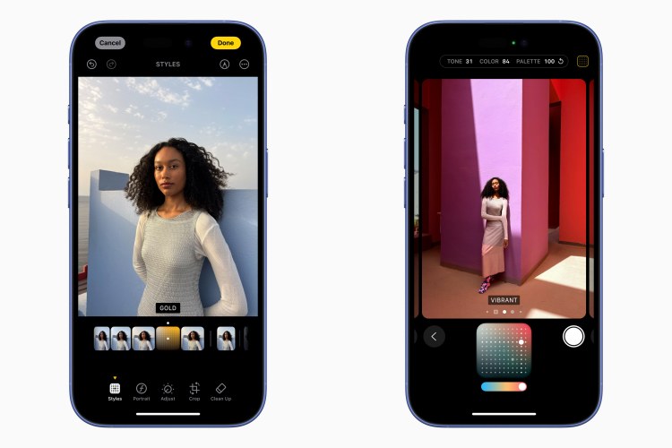 兩系列四款機型均新增全新側面按鈕「相機控制」,可快速啟用相機、拍攝照片並開始錄影。全新相機預覽畫面協助使用者進行照片取景,並調整縮放、曝光或景深等其他控制選項,只須在「相機控制」上滑動手指。新功能「攝影風格」能即時調整顏色、重點、陰影等,不像過去許多濾鏡採用單一顏色套用在場景。影片現在可以用空間音訊拍攝,透過「混音」剪輯影片音效的創意新方式,可在拍攝後調整聲音,聚焦鏡頭內的人的語音,打造宛若在專業攝影棚完成的錄影效果。可將語音音軌前置,環境噪音則放入背景音,透過演算法具備降低風切聲的功能,提升音訊品質。