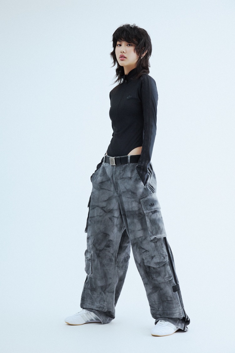 選用上窄下寬的穿搭法則,利用窄版連體上衣和寬鬆工裝褲,營造出帥氣與性感兼具的酷辣風格。TAEKWONDO 鞋款則為整體造型增添了率性風範。