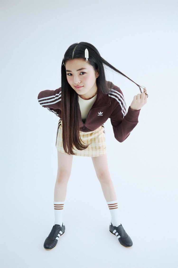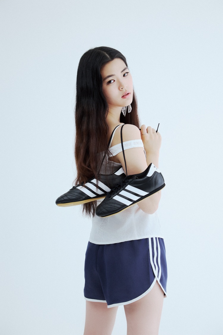 選擇甜美單品搭配經典的三線運動褲,既能保留運動的舒適感,同時增添個性感。TAEKWONDO 鞋款的輕盈設計,更為此風格搭配注入了活力與俏皮感。