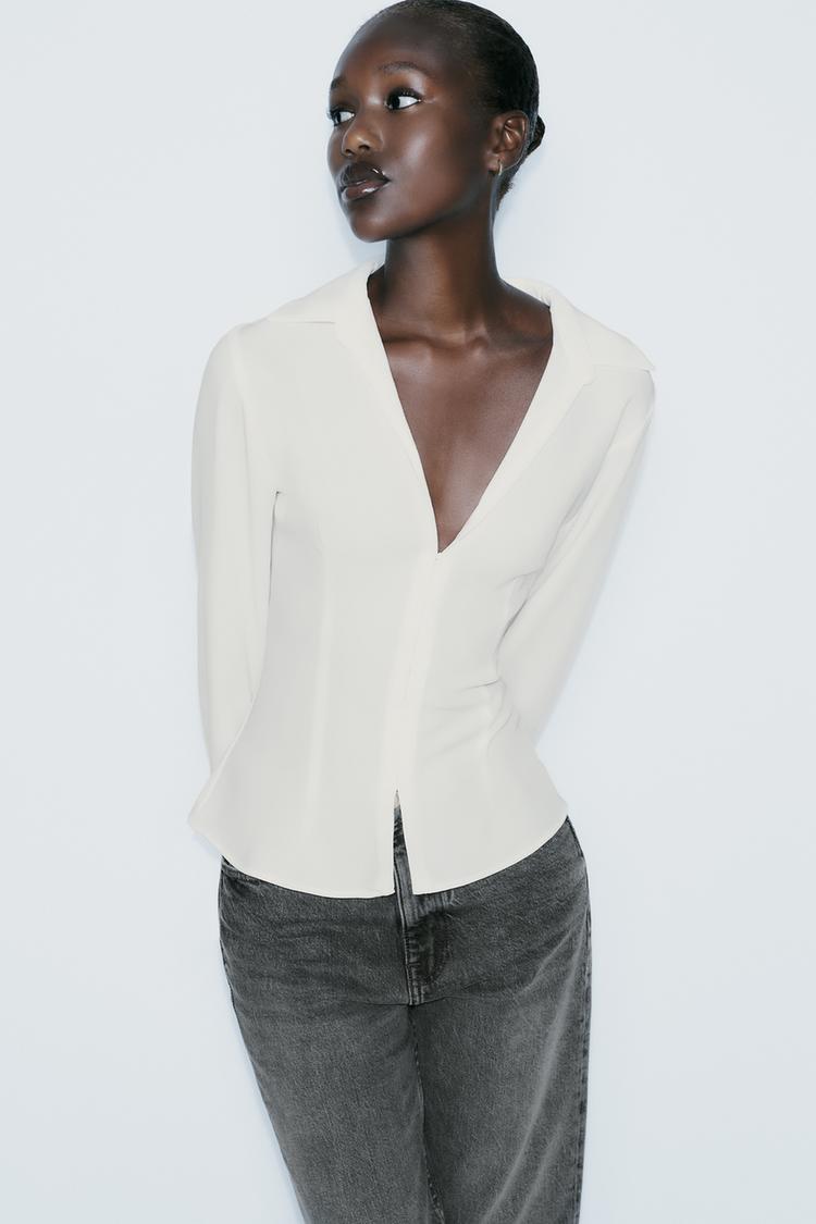 上圖這一款襯衫採用豎尖領設計,長袖並且在袖口處有開叉細節。設計上乾淨俐落,沒有過度繁複的元素,強調腰身的剪裁,能有效修飾身形,增添優雅與修長感。可搭配簡單首飾,為整體造型畫龍點睛!(價格:NT$1,290)