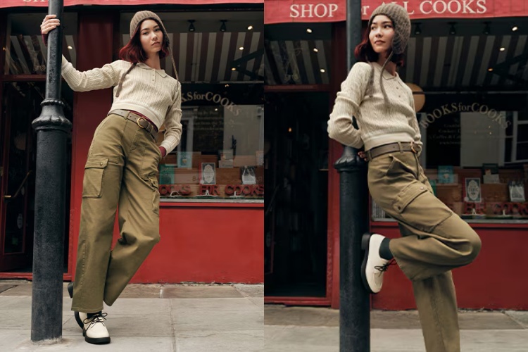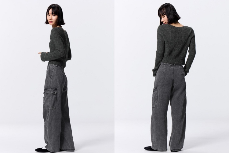 工裝褲一直以來都是時尚界的熱點,而 GU 這款錐形工裝褲將實用性與時尚感完美融合。褲身的大口袋設計附有釦子,能防止物品滑出,非常實用且便利。簡單搭配一件短版針織衫,不僅中和了工裝褲的陽剛與隨性,還為整體增添了一抹休閒甜美的氛圍。