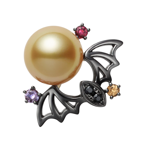 作為萬聖節的最佳代表,蝙蝠造型為此系列不可或缺的創作靈感。其中一款胸針由黑銠加工的18K黃金與尖晶石勾勒出蝙蝠展翅的形象,飛向如圓月般閃耀的金南洋珍珠,彩色寶石幻化成點點繁星,生動而引人注目。(NT$ 77,000)