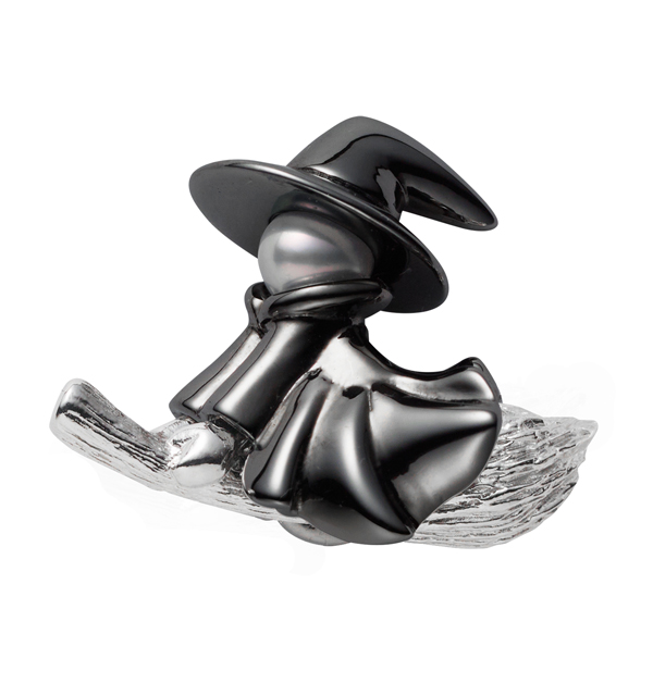 騎着掃帚飛馳的女巫胸針,以細膩的金工細節,搭配上日本Akoya白色珍珠的虹彩光澤,更顯活潑靈動。(NT$ 21,000)