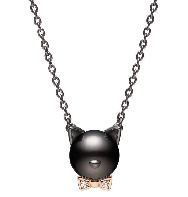 充滿神秘魔幻色彩的黑貓以黑南洋珍珠打造化身為造型墜鏈,精巧的耳朵和鼻子以黑銠加工的18K白金與黑南洋珍珠光澤完美融合,並配以鑲嵌鑽石的18K粉紅金蝴蝶結,成為送給俏皮可愛摯友的絕佳選擇。(NT$ 141,000)