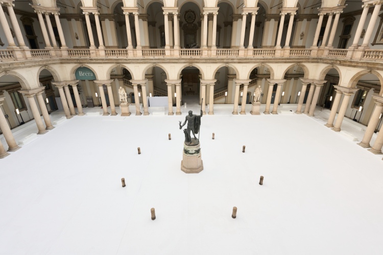 對比於上次以紅、白光交錯打造視覺上的變換,2025春夏秀場選在義大利米蘭的布雷拉畫廊 (Pinacoteca di Brera),這裡是米蘭人心中榜上有名的藝術殿堂,一走入就感受到明亮的自然光、建築上的拱形結構,以及傳承歷史、藝術的雕塑品,讓此次服裝系列與空間、藝術產生對話與連結。