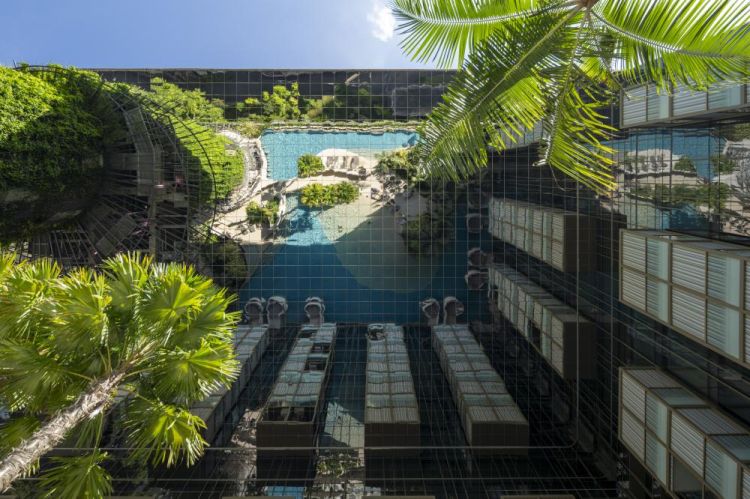在偌大的建築量體中,建築師嘗試融入四大主題花園,好比一樓的「森林露台」,是唯一可讓路人進入的公共空間,擁有層疊的水景和數十種植栽,打造遠離塵囂的「綠洲」。建築師嘗試透過「虛」空間,增加建築量體的多樣性,透過虛與實間轉換,串連 347 間客房,感受大自然與居住空間的緊密和諧。